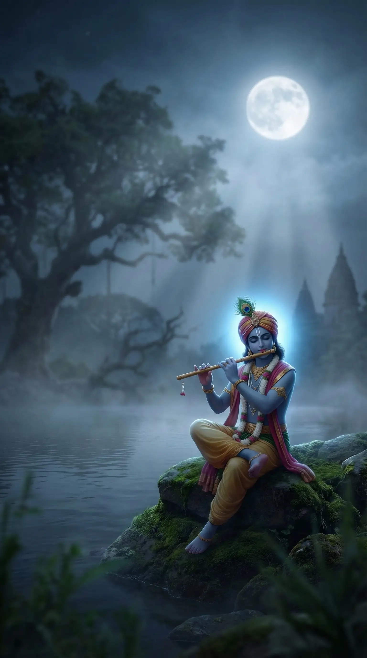 A serene depiction of Lord Krishna sitting beside a calm river under a glowing full moon, playing his divine flute. Surrounded by mist, trees, and a peaceful night atmosphere, this artwork captures spiritual calm and devotion. Perfect as a wallpaper of sri krishna, it beautifully represents bhagavan krishna photos and the soothing essence of lord krishna god photos.